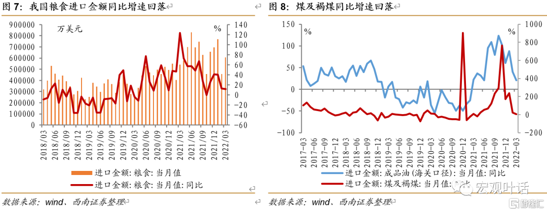 單月來看,3月單月進口金額增速轉負,大多商品基數升高進口數量增速回落,部分商品進口金額有支撐。與上月預期一致,本月進口增速回落明顯,3月進口金額同比下降0.1%,自2020年8月後首次轉爲負值。上遊商品進口受到海外因素影響明顯,附加值較高產品受影響相對較小。3月,肥料、鐵礦砂及其精礦、原油、鋼材進口數量同比下降36.61%、14.52%、13.99%和23.41%,但原油進口數量環比在上月回落25。53%後上升17.53%,煤及褐煤進口數量也有所回升,成品油進口數量環比繼續下降。全球大宗商品價格高位下支撐進口金額,原油進口金額同比上漲36.01%,在基數回升明顯下增速繼續回升;鐵礦砂及其精礦進口金額環比上漲18.57%,較前值增速回升25.66個百分點。芯片較短缺下,集成電路進口金額同比上升6.95%,較2月回落6.41個百分點。預計後續地緣政治風險仍將持續影響進口,進口金額同比增速或繼續放緩,中長期在供應鏈修復、國內需求增長的拉動下,進口有望實現恢復性增長。
