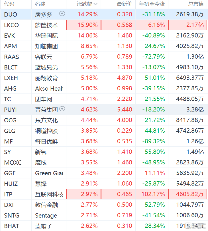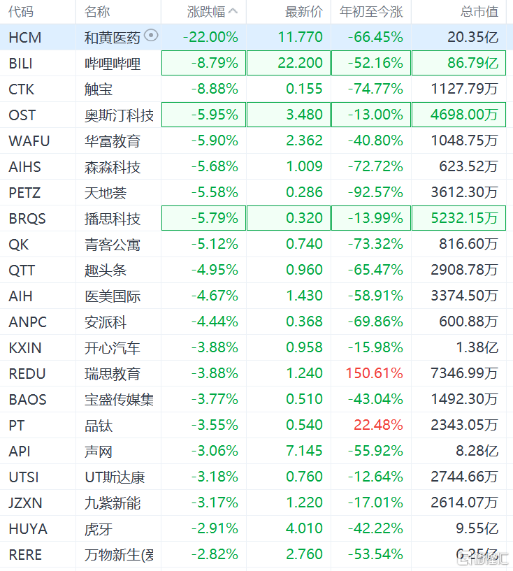 格隆匯5月2日丨房多多漲超14%,每日優鮮、新氧漲超3%,慧擇、貝殼、汽車之家、霧芯科技、新東方漲超2%,高途、理想汽車、知乎、富途控股漲超1%。跌幅方面,和黃醫藥大跌22%,嗶哩嗶哩跌逾8%,小牛電動、愛奇藝、拼多多跌逾2%,老虎證券、第九城市、蔚來、網易跌逾1%,小鵬汽車、唯品會、百度、網易等小幅下跌。