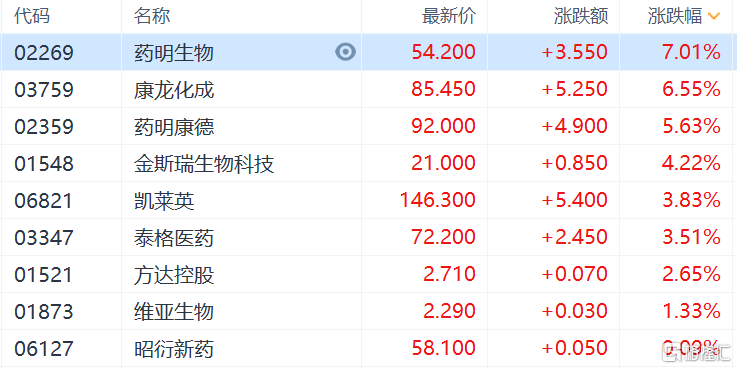 醫藥外包概念大漲,藥明生物漲超7%,康龍化成漲超6%,藥明康德漲超5%,凱萊英、泰格醫藥漲超3%。