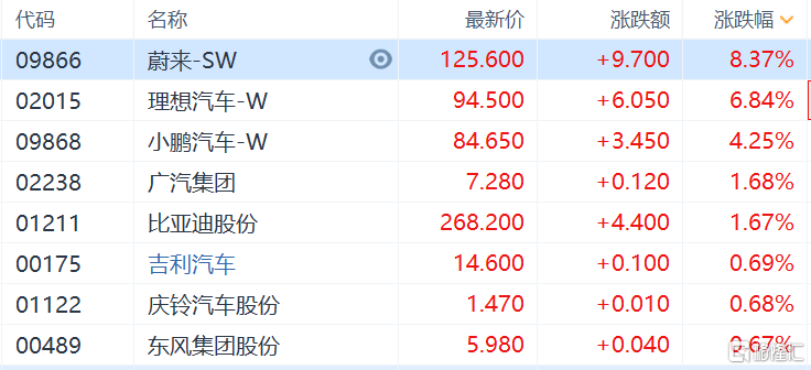 汽車股走高,蔚來漲超8%,理想汽車漲超6%,小鵬汽車張超4%,廣汽集團、比亞迪股份漲超1%。