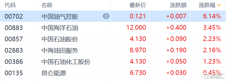 石油股普漲,中國油氣控股漲超6%,中國海洋石油漲超3%,中海油田服務、中石油漲超2%,中石化超1%。