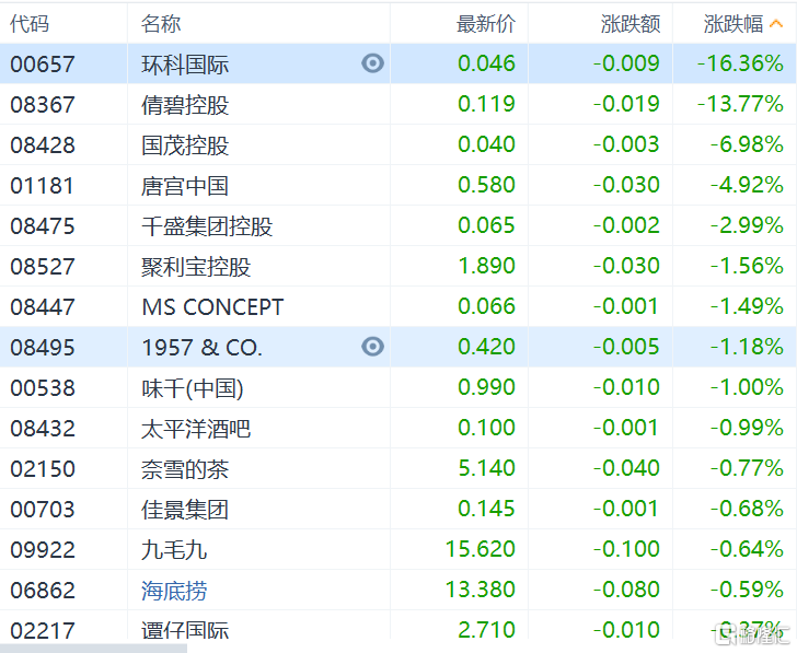 餐飲股大跌,千盛集團跌超2%,未籤中國跌超1%,九毛九、海底撈等跟跌。