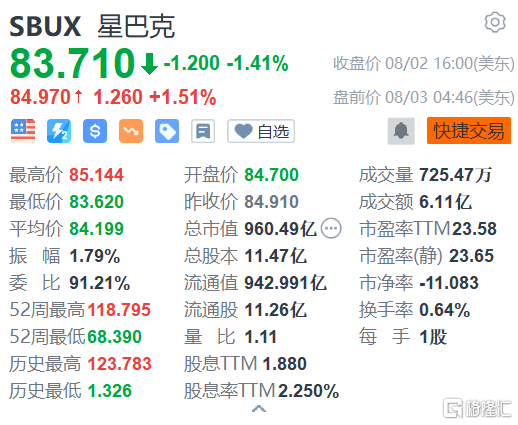 美股異動 | 星巴克(SBUX.US)盤前漲超1% Q3業績超預期