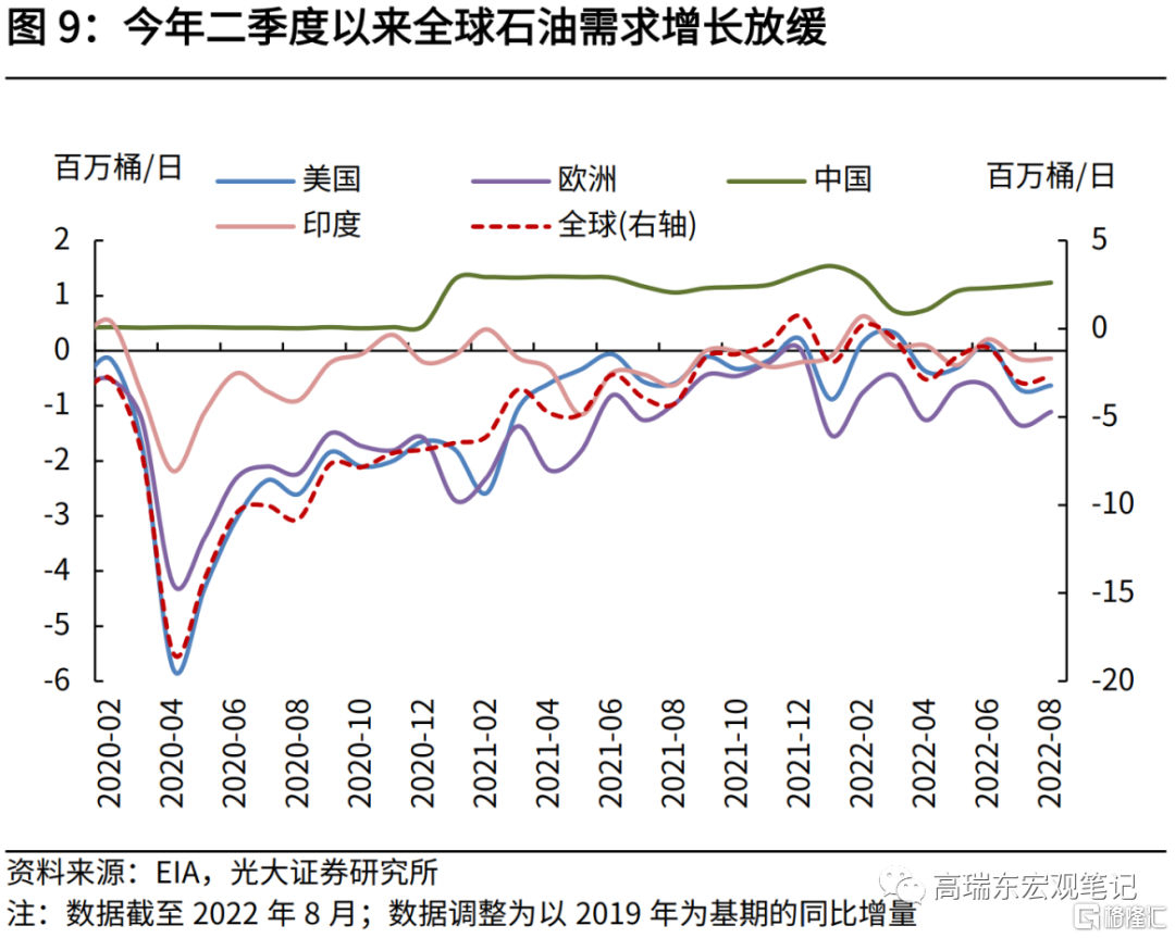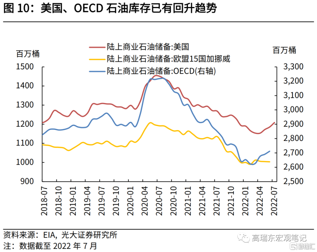 原油方面,6月以來,伴隨油價的一路下跌,原油的三重屬性均有回落或收斂。金融屬性方面,美聯儲大幅加息背景下,金融屬性削弱、壓制油價上漲;地緣政治方面,儘管俄烏衝突仍在持續,地緣風險仍有不確定性,但鑑於歐洲制裁已有邊際放鬆,計劃年末使用價格上限取代禁運措施,以保證俄羅斯原油流向市場,對未來供給短缺的擔憂也在逐步消退;商品屬性方面,需求轉弱預期已在逐步兌現,需求主導原油定價回落,但鑑於供給增量有限,將對油價形成底部支撐。我們預計原油仍處在緩慢下行通道,下半年原油價格震盪中樞可能在90美元/桶附近。因此,向前看,原油價格對汽油和柴油價格的影響將趨於回落,能源項對通脹環比形成拖累。