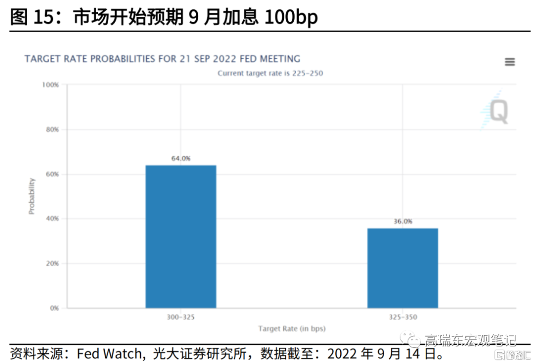 7月議息會議中,FOMC與會者對抗擊通脹達成空前一致的共識,貨幣政策將更加緊縮,以此穩定市場對美聯儲維持價格穩定的信心。若公衆對美聯儲控制通脹的決心產生動搖,則高通脹可能變得越來越頑固,導致通脹預期以及通脹的相互強化。8月,美聯儲主席鮑威爾在傑克遜霍爾會議中,表明美國將繼續採取措施“強力”抗擊通脹。因此,短期內,美聯儲連續、大步的加息路徑較難改變,我們仍然延續此前觀點,認爲9月加息75bp。