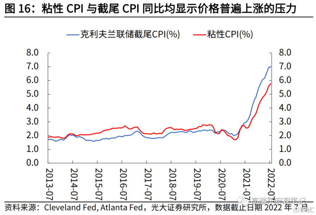 第一,美國通脹粘性持續走高。亞特蘭大聯儲粘性CPI(Sticky CPI)已從年初的4.2%一路上行至7月的5.8%,該指標統計了CPI籃子中,價格變化相對緩慢的項目的通脹率。該指標上升表明,通脹壓力可能會持續較長一段時間。另外,克利夫蘭聯儲截尾CPI(Trimmed CPI),是在調整了支出權重位於價格變化分佈的前8%和後8%的項目後,計算得出的CPI指數,其同比增速也已從1月的5.4%上行至7月的7.0%,凸顯普遍的價格上漲趨勢。
