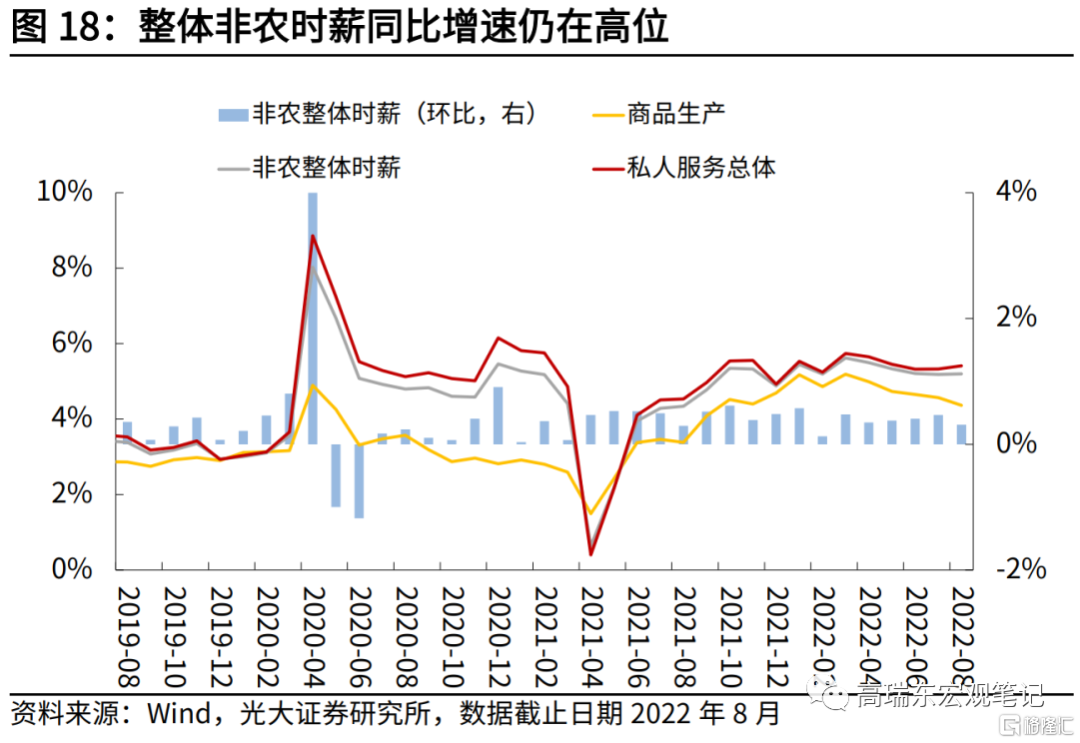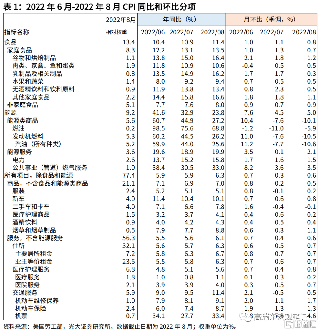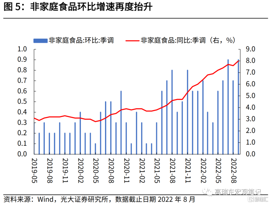 8月非家庭食品價格季調後環比擡升,其中全餐服務價格環比增0.8%,高於上月的0.6%,顯示居民外出餐飲需求增加而服務業時薪增速維持高位,導致外出餐飲價格持續上行。向前看,美國勞動力市場,尤其是餐飲業勞動力供需緊張狀態仍將持續,支撐薪資增速和外出餐飲價格維持高位。