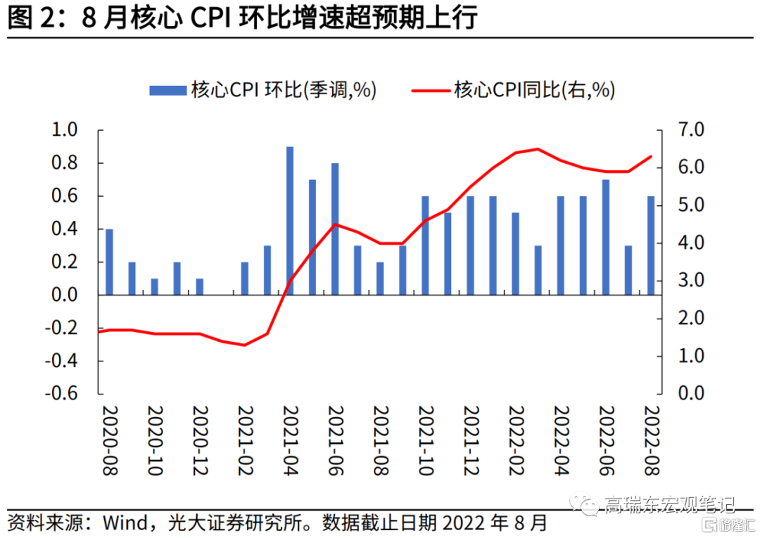 8月核心CPI超預期上行,同比增6.3%,季調後環比升0.6%(前值分別爲5.9%、0.3%)。其中,核心商品環比上行0.5%(前值0.2%);核心服務環比上行0.6%(前值0.4%)。季調後環比看,住宅(+0.7%,前值0.5%)、新車(+0.8%,前值0.6%)、交通服務(+0.5%,前值-0.5%)、醫療護理服務(+0.8%,前值0.4%)爲主要貢獻項。
