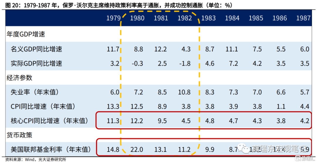 1979年8月6日,保羅·沃爾克(Paul Volcker)被任命爲美聯儲主席,在他的領導下,美聯儲堅定開啓緊縮政策,聯邦基金利率大幅擡升,並在1980年年末達到了22%的水平。在1979-1987年期間,聯邦基金利率始終維持高於CPI同比增速的水平,成功抑制通脹,經濟在高通脹時代結束後,也穩步修復。