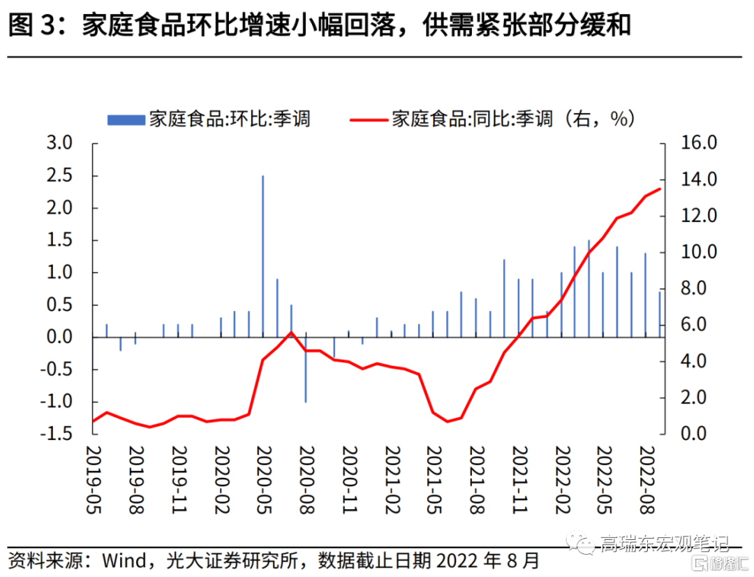 8月食品價格季調後環比升0.8%,較前值(+1.1%)小幅回落,主要與家庭食品價格漲幅收窄有關,環比升0.7%,低於上月的1.3%,而非家庭食品價格環比漲幅擴大,環比升0.9%,高於上月的0.7%。
