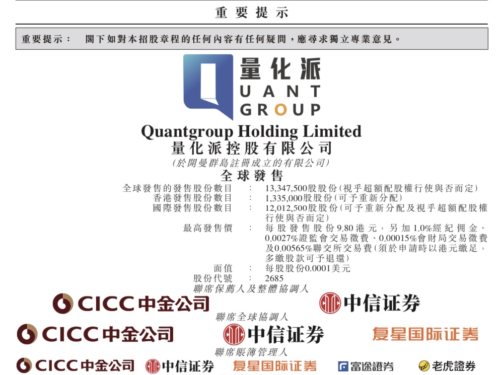 量化派控股有限公司(Quantgroup Holding Limited, 2685.HK)啟動香港IPO,招股期為11月19日至11月24日,擬全球發售13,347,500股,並設15%超額配股權;每股發售價介乎8.80–9.80港元,每手500股,入場費約4,949.42港元;預期11月27日於聯交所主板掛牌,聯席保薦人為中金公司及中信證券。