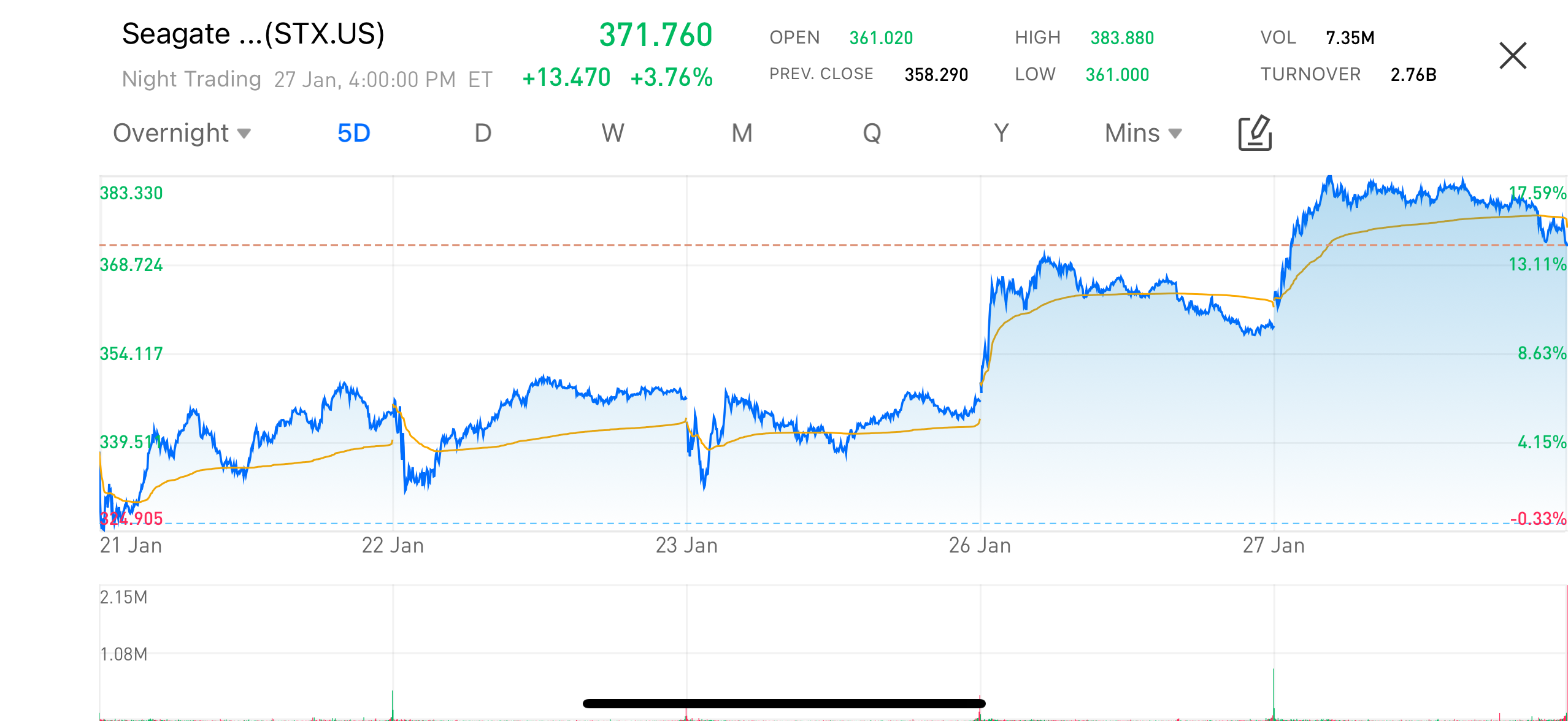 在AI算力與數據中心建設持續推進的背景下,存儲產業鏈景氣度再度得到驗證。希捷科技(STX.US)最新披露的季度財報顯著超出市場預期,帶動股價在盤後及夜盤交易中延續強勢:美東時間1月27日,股價夜盤最新報 371.76美元,較前一交易日收盤價 358.29美元 上漲 3.76%,盤中一度沖高至 383.88美元、刷新階段高位。