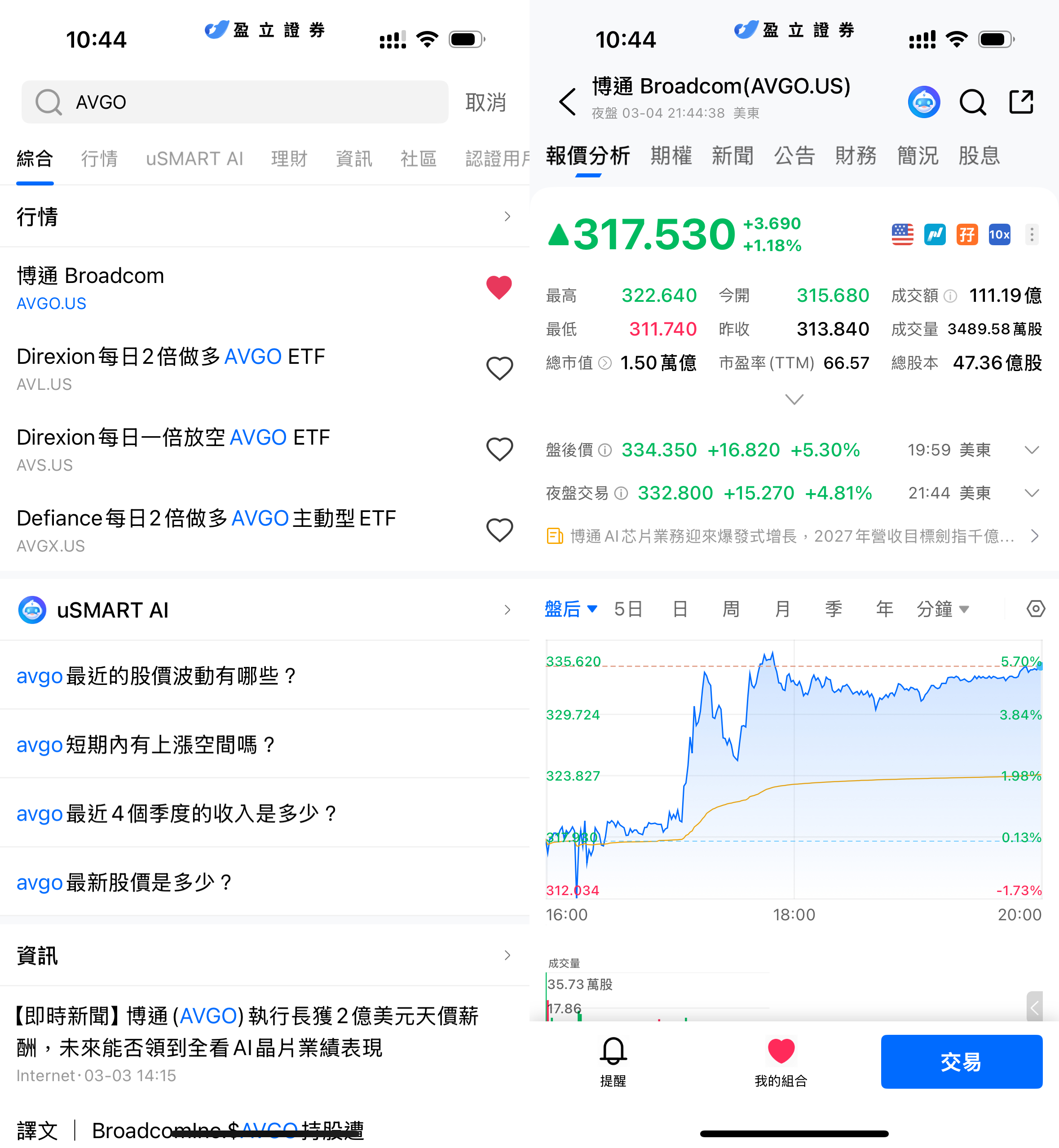 登入 uSMART HK APP 後,於頁面最右上方點擊「搜索」,輸入標的代碼(AVGO.US)並進入詳情頁,瞭解交易詳情與歷史走勢。點擊右下角「交易」,選擇交易類型,最後填寫交易條件後送出訂單即可。