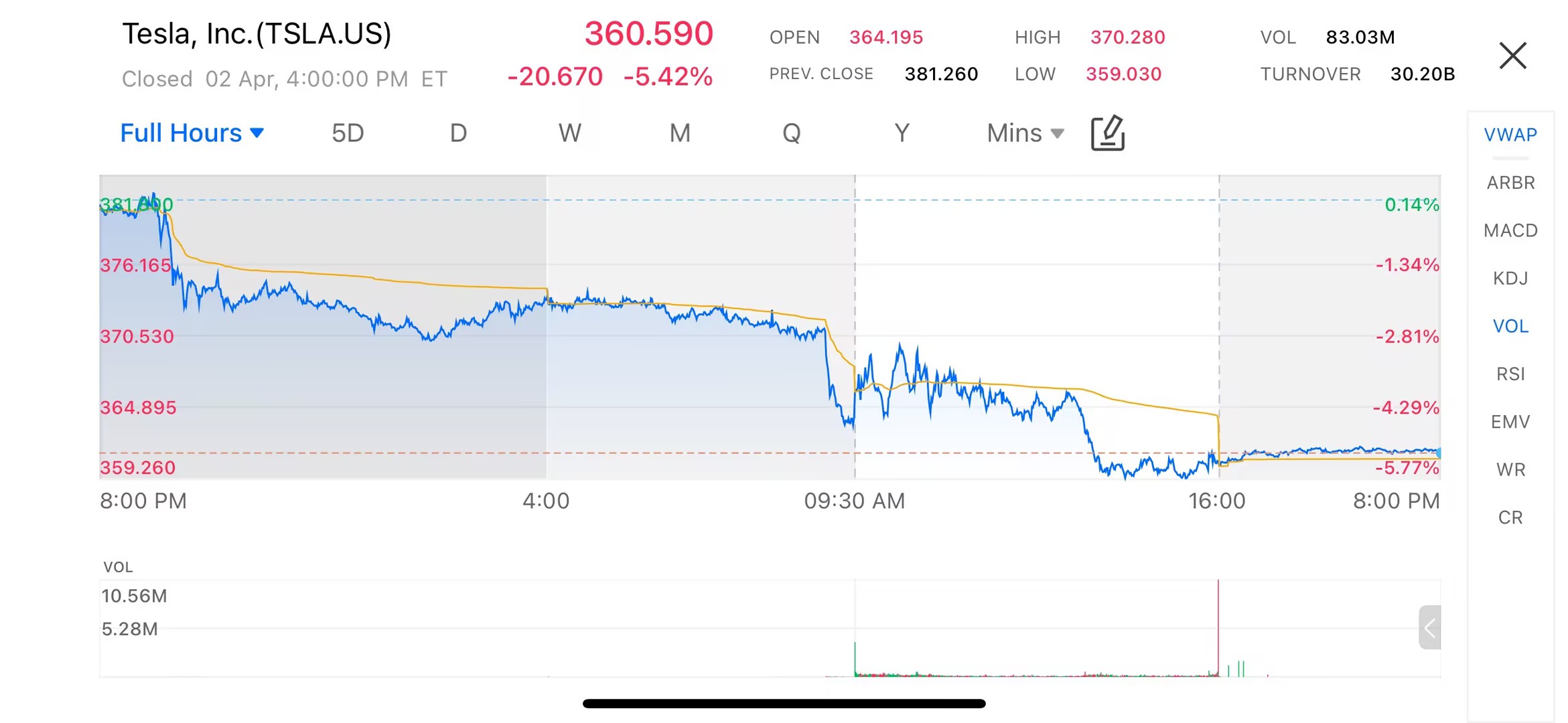 4月3日,特斯拉(TSLA.US)公佈2026年第一季度生產與交付數據。受核心指標不及市場預期影響,公司股價當日顯著承壓,盤中一度跌破360美元關口,最低觸及約359美元,最終收跌5.42%,報360.59美元,創下年內最大單日跌幅之一,市場情緒明顯轉弱。