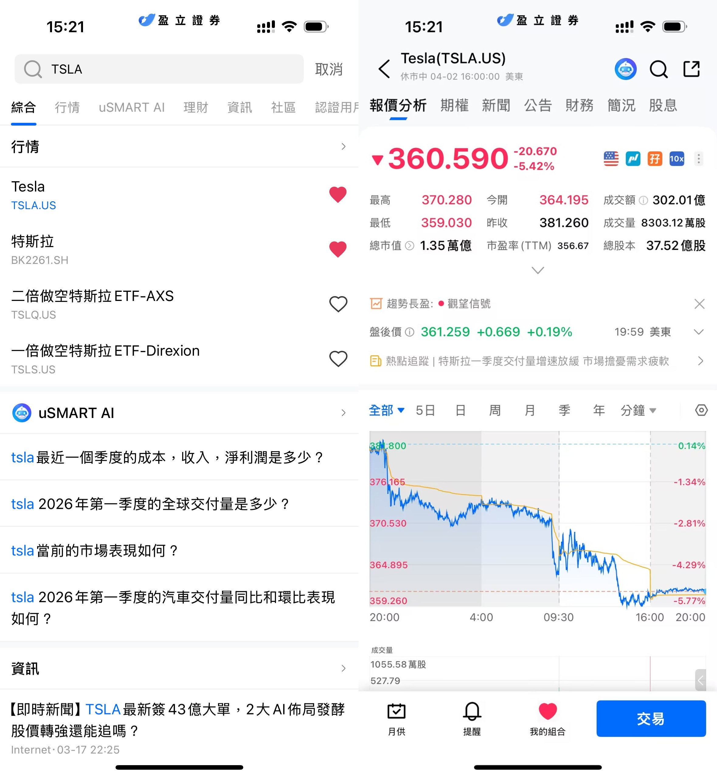 登入 uSMART HK APP 後,於頁面最右上方點擊「搜索」,輸入標的代碼(TSLA.US)並進入詳情頁,瞭解交易詳情與歷史走勢。點擊右下角「交易」,選擇交易類型,最後填寫交易條件後送出訂單即可。