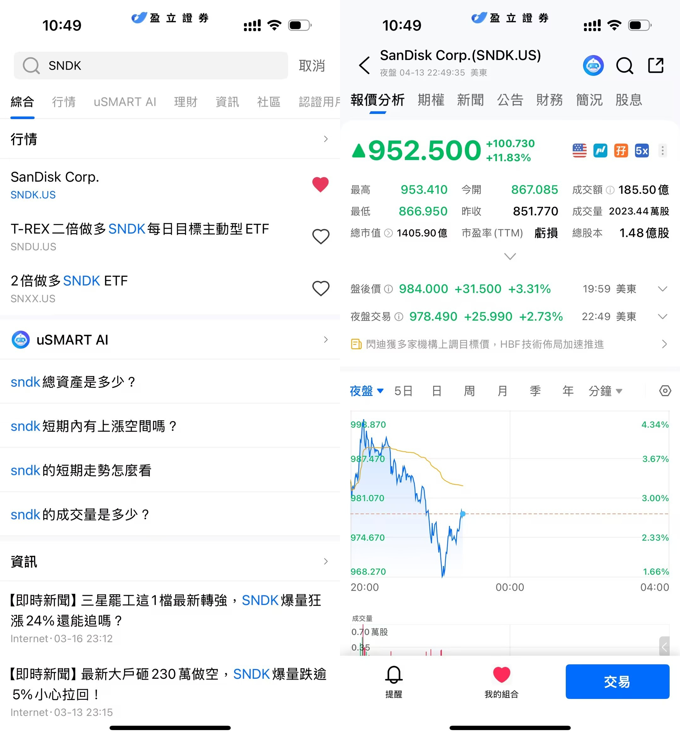登入 uSMART HK APP 後,於頁面最右上方點擊「搜索」,輸入標的代碼(SNDK.US)並進入詳情頁,瞭解交易詳情與歷史走勢。點擊右下角「交易」,選擇交易類型,最後填寫交易條件後送出訂單即可。