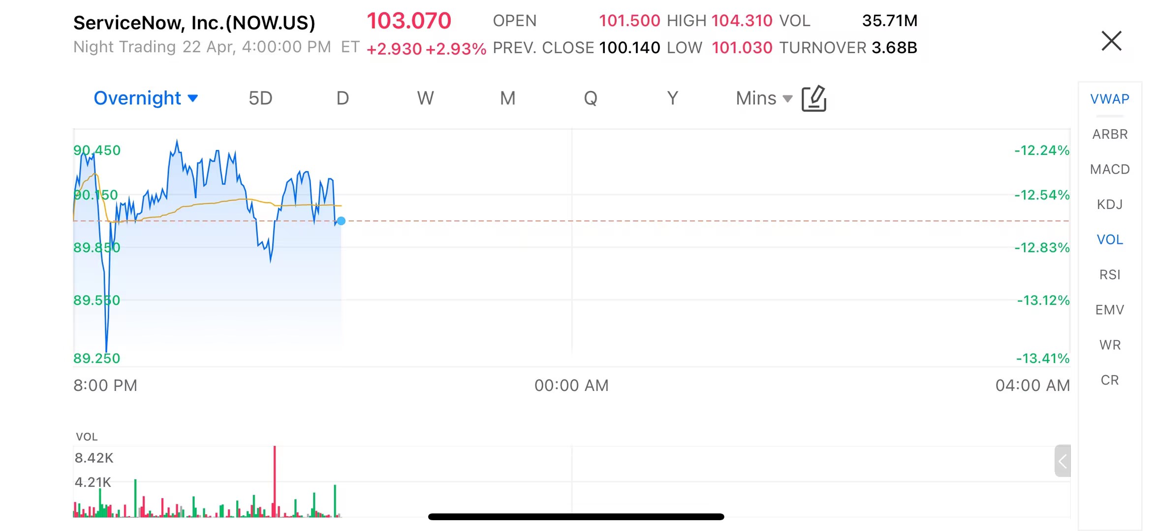 美東時間4月22日盤後,ServiceNow(NOW.US)股價上漲約2.93%,報103.07美元。此前公司公佈2026年第一季度財報,核心營收與利潤指標均超出市場預期,同時上調全年訂閱收入指引,提振市場情緒。