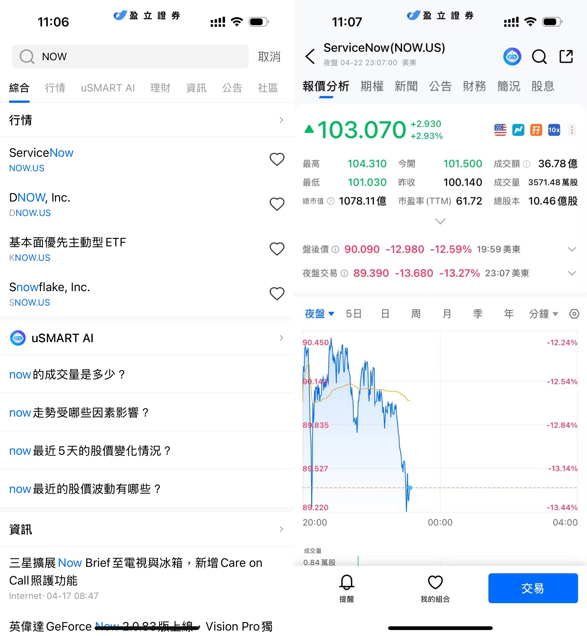 登入 uSMART HK APP 後,於頁面最右上方點擊「搜索」,輸入標的代碼(NOW.US)並進入詳情頁,瞭解交易詳情與歷史走勢。點擊右下角「交易」,選擇交易類型,最後填寫交易條件後送出訂單即可。