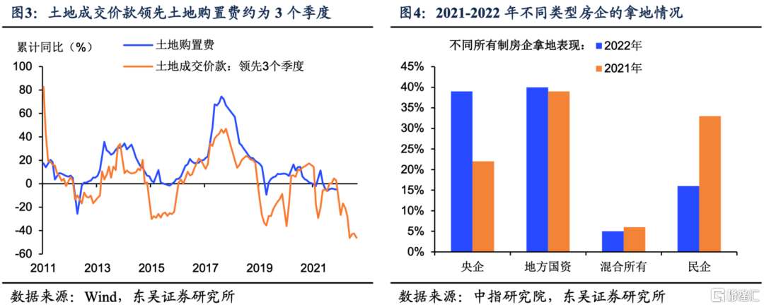 土地購置費的預測我們參考了今年前三批集中供地的情況,因爲歷史上土地成交價款往往領先土地購置三個季度,考慮到2021-2022年各類房企的拿地的變化(圖4),我們假設2022Q4-2023Q1央企和地方國資拿地同比增10%,民企拿地同比降30%(混合所有房企2/3等同央企和地方國資,1/3等同民企),則計算得到2023年土地購置費同比增速爲-17.2%。考慮樂觀(央企和地方國資拿地20%,民企拿地-10%)和悲觀(央企和地方國資拿地零增長,民企拿地-50%)兩種情形,對應的2023年土地購置費增速分別爲-14.7%和-21.8%。