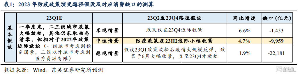 居民消費:2023年增速4.7%,負缺口約爲9560億元。鑑於疫情仍是影響2023年消費復甦的核心變量,我們預測假設的出發點爲防疫政策嚴苛程度在不同情景下的演變。基本假設爲兩會後(即一季度末),二三線城市防疫政策明顯放鬆,而一線城市考慮到穩定、三線以外城市考慮到醫療資源有限,仍維持動態清零政策,但相對於2022年防疫政策邊際放鬆(表1)。根據後續防疫政策的嚴格程度,我們對於居民消費的預測分爲中性、樂觀、悲觀三種情景假設。