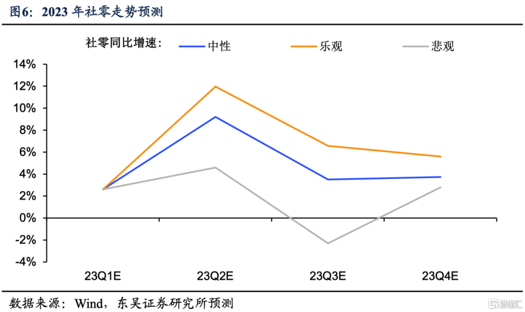 測算重點參考了22Q2我國香港和22Q3杭州在防疫政策放鬆後的社零增速(分別爲2.8%、13%),基本設定爲二三線城市增速領跑,一線和三線以外城市根據假設乘以0.75-0.85間的係數。中性情形下,假設防疫政策在23H2邊際小幅收緊,預計2023年增速4.7%,對標5%的實際增速,社零缺口爲9,559億元。樂觀情形下(政策僅在23Q4邊際收緊)和悲觀情形下(假設23Q1政策放開後疫情大規模反彈,政策於6月大幅收緊,直至23Q4才放鬆),預計2023年增速分別爲6.6%、1.9%。