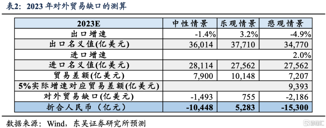 對外貿易:2023年增速-1.4%,負缺口爲10448億元。根據我們此前報告(《2023全球增速下滑=多大的出口逆風?》)測算,中性、樂觀、悲觀情形下,我國2023年出口增速分別爲-1.4%、3.2%、-4.9%。若我們假設2023年進口增速爲2%,上述三種情景對應的缺口/盈餘(負數/正數)分別爲-10448、5283、-15300億元(表2)。
