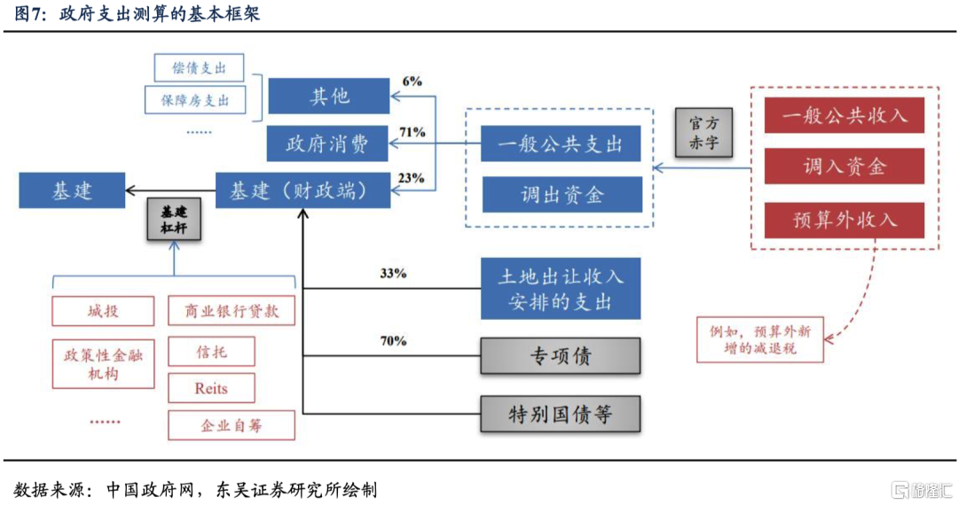 政府消費和基建投資:2023年增速爲6.6%和6%,正缺口約爲1990億元。對於2023年政府端支出的預測,如圖7所示,我們採取從收入和融資端入手來估算支出(圖7中是由右向左),其中政府消費的主要來源是一般公共預算,而基建既有財政端的資金來源(一般公共預算、土地出讓金以及專項債),也有非政府資金的參與。