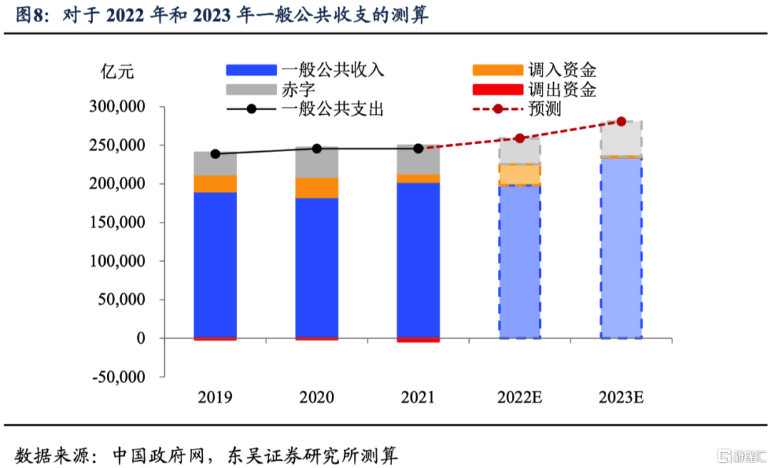 出口和土地收入拖累=赤字率上升、專項債保持高水平。展望2023年,此前支持經濟的出口將轉爲拖累,這意味着財政穩增長的壓力更大,預計赤字率將破3%,則一般公共預算支出增速約爲8%(約28萬億元)(圖8),而爲了對衝土地收入的繼續萎縮(中性情形下2023年土地出讓金同比增速爲-17%),專項債發行規模需要維持在較高水平——考慮到2022年專項債規模約爲41500億元,中性形下2023年專項債依舊應該維持在大致相當的水平。