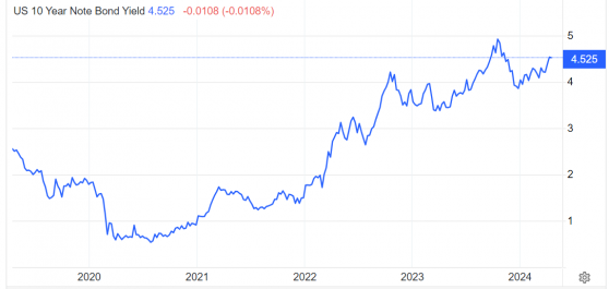 在貨幣政策、地緣衝突等因素下,近期美元和美債收益率持續上升,呈現出強勁的勢頭。截至4月15日,10年期美債收益率再次攀升,並穩定在4.5%以上,屢創年內新高。與此同時,美元指數也接近106關口,達到自去年11月以來的高位。