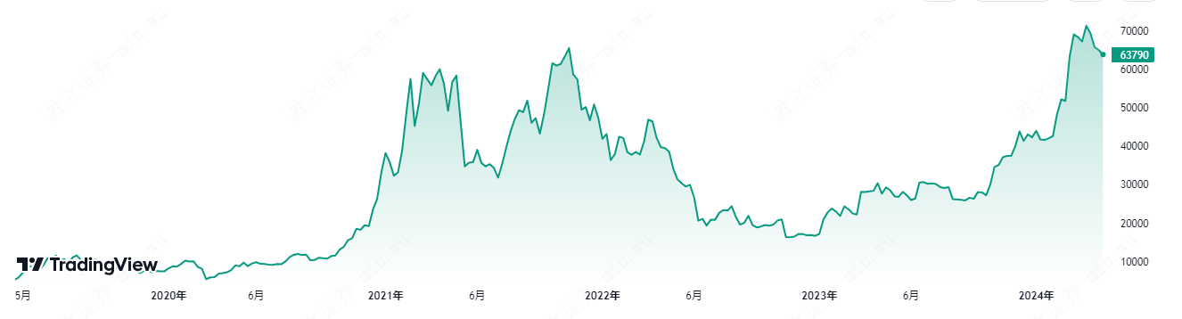 根據比特幣過去五年的價格走勢(下圖)來看,比特幣的價格在過去一年內實現了高達200%的增長率,最高價達到73,794美元。不斷增長的資產規模進一步彰顯了這一資產投資價值的重要性,引起了越來越多的關注。