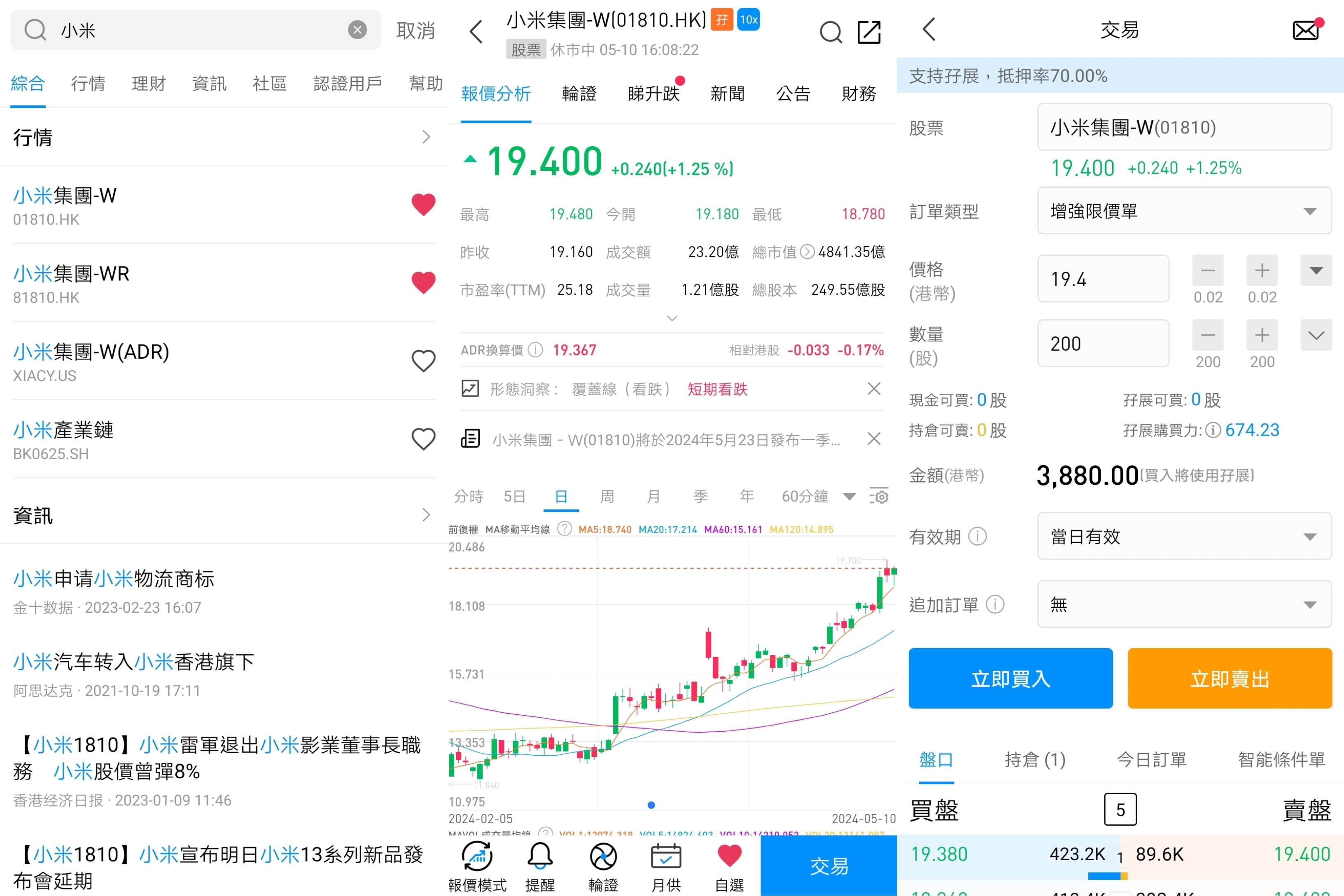 登入uSMART HK APP之後,從頁面最右上方點擊選擇「搜索」,輸入「小米」,可進入詳情頁瞭解交易詳情和歷史走勢,點擊右下角「交易」,選擇「買入/賣出」功能,最後填寫交易條件後送出訂單即可;圖片操作指引如下: