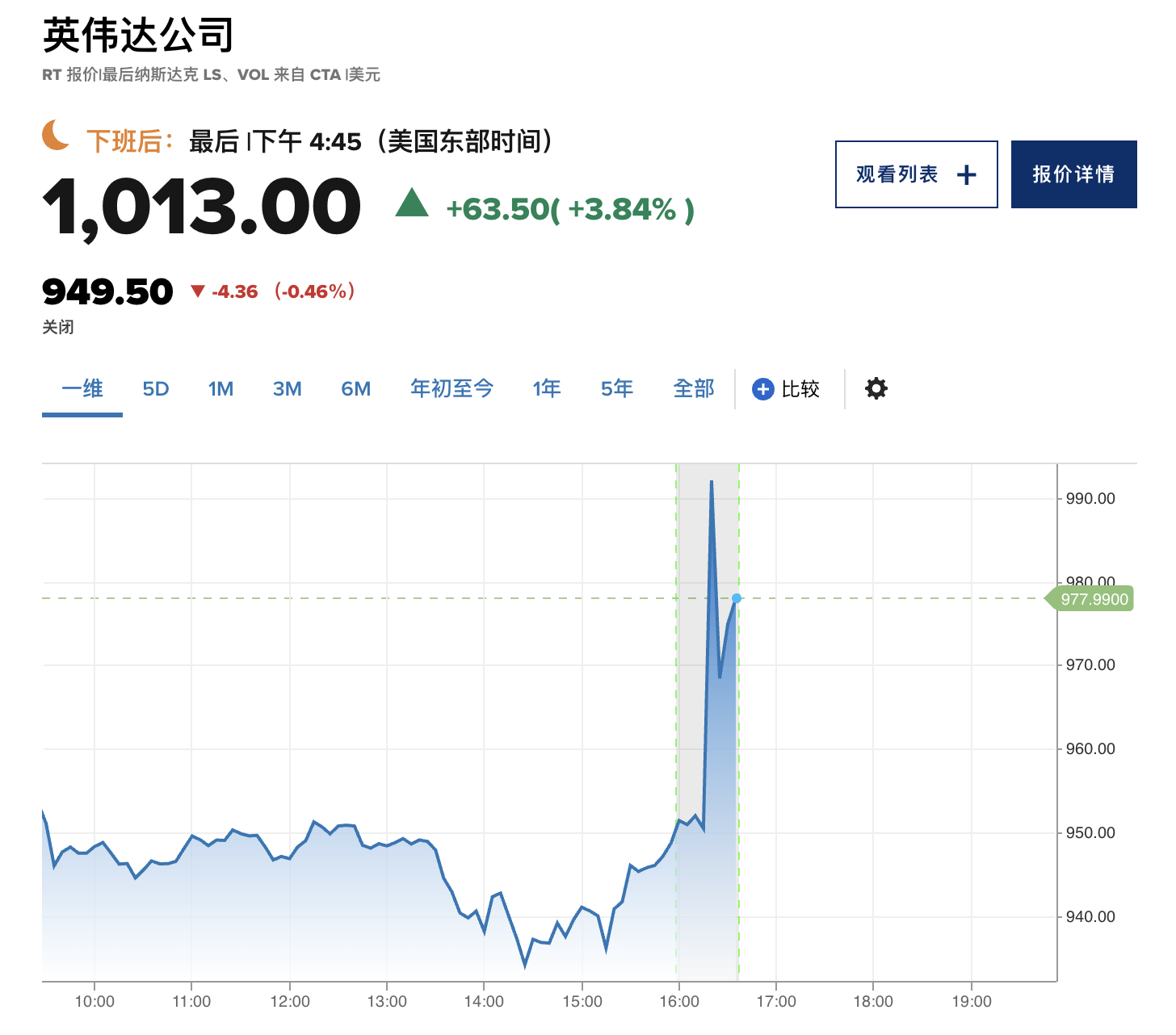 英偉達(NVDA) 在週三發布的財報顯示,第一財季業績超出分析師預期,激勵盤後股價急升逾 7%,首次突破1000美元,截至5月23日,該股今年迄今累計已漲逾 91%。