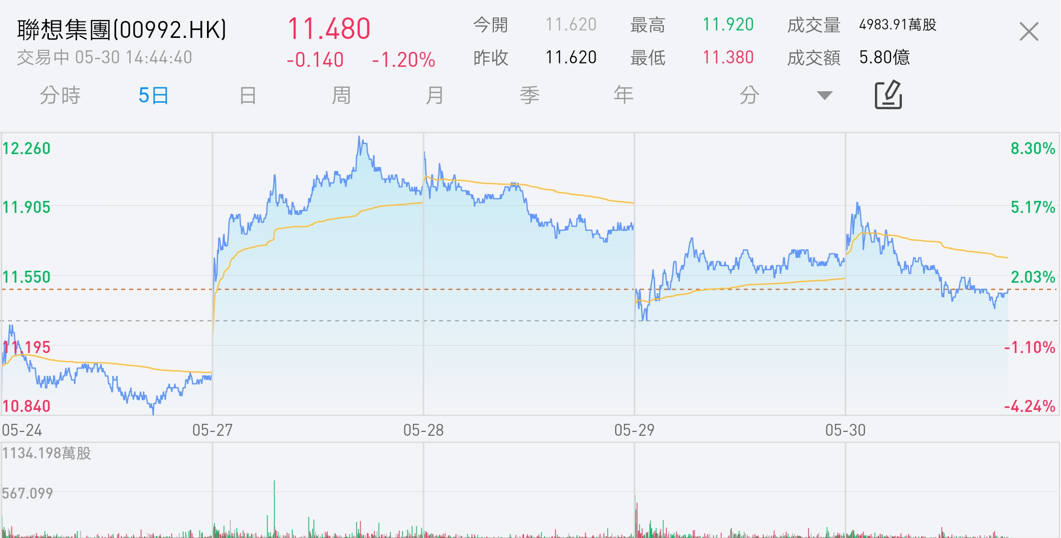 5月27日,聯想(0992.HK)股價盤中一度漲超10%,至12.26港元/股,創2015年6月以來新高。截止到5月30日,聯想股價依舊表現良好。大摩、高盛、中信里昂等多家大行相繼表示看好聯想集團,認為AI PC的趨勢將為該公司股價帶來顯著上漲空間。因為擁有自研AI晶片、最全面的AI特性以及AI助手,聯想將成為AI PC市場的最大受益者之一。