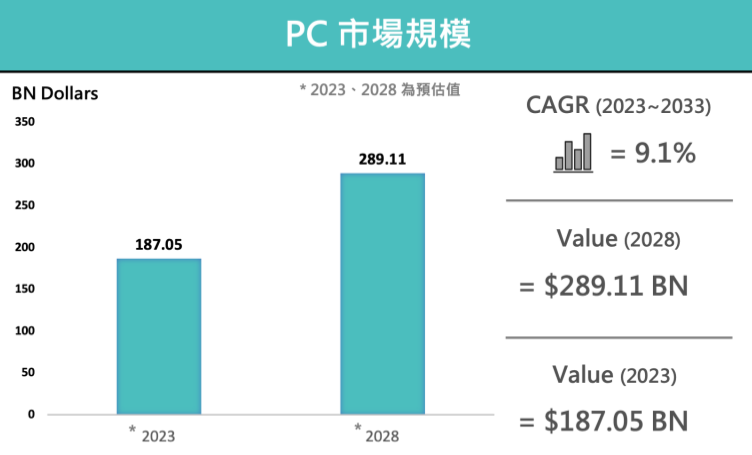 根據 Yahoo Finance 的統計顯示,2023年全球 PC 市場規模大約為 1,870 億美元,預估 2028 年全球 PC 產值將上升至約 2,890 億美元,年複合成長率達 9.1%,其他研調機構也大致認為 PC 產業的產值在未來 5~10 年約有 5~10% 的年複合成長率。目前 PC 市場市占率前 5 大廠商分別為 Lenovo、HP、Dell、Apple、Asus。