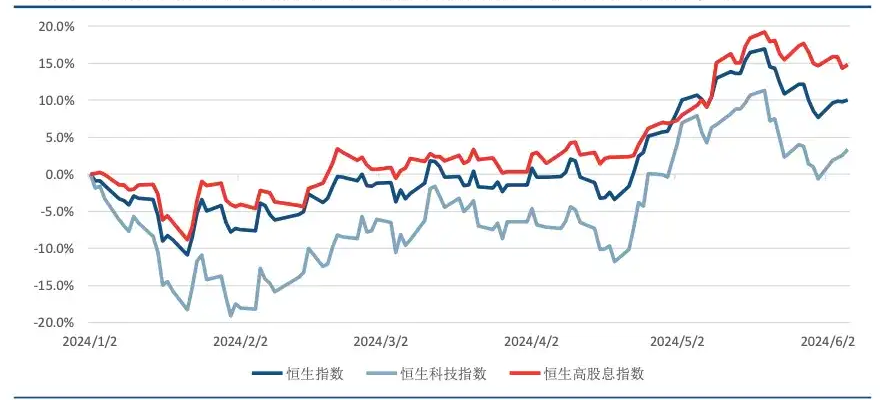即使在近期回調背景下,恆生高股息指數表現也更加穩健。從投資者結構來看,港股高股息板塊南向資金佔比更高,有較強韌的資金面支撐。恆生綜合指數南向資金佔比為31.48%,而恆生高股息率指數南向資金佔比為39.58%,顯著高於大盤。從資產特徵來看,港股估值顯著低於A股因而股息率更高,港股通紅利資產具有更高性價比。下圖是2024年以來恆生指數、恆生科技指數、恆生高股息率指數總跌幅。