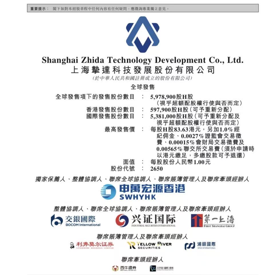 新能源企業摯達科技發展股份有限公司(Shanghai Zhida Technology Development Co., Ltd., 2650.HK)啟動香港IPO,招股期為2025年9月30日至10月6日,擬全球發售約5,978,900股H股,並設有15%超額配股權;每股發售價介乎66.92—83.63港元,每手50股,入場費約4,223.68港元;預計2025年10月10日於聯交所主板掛牌。申萬宏源融資(香港)有限公司為獨家保薦人。