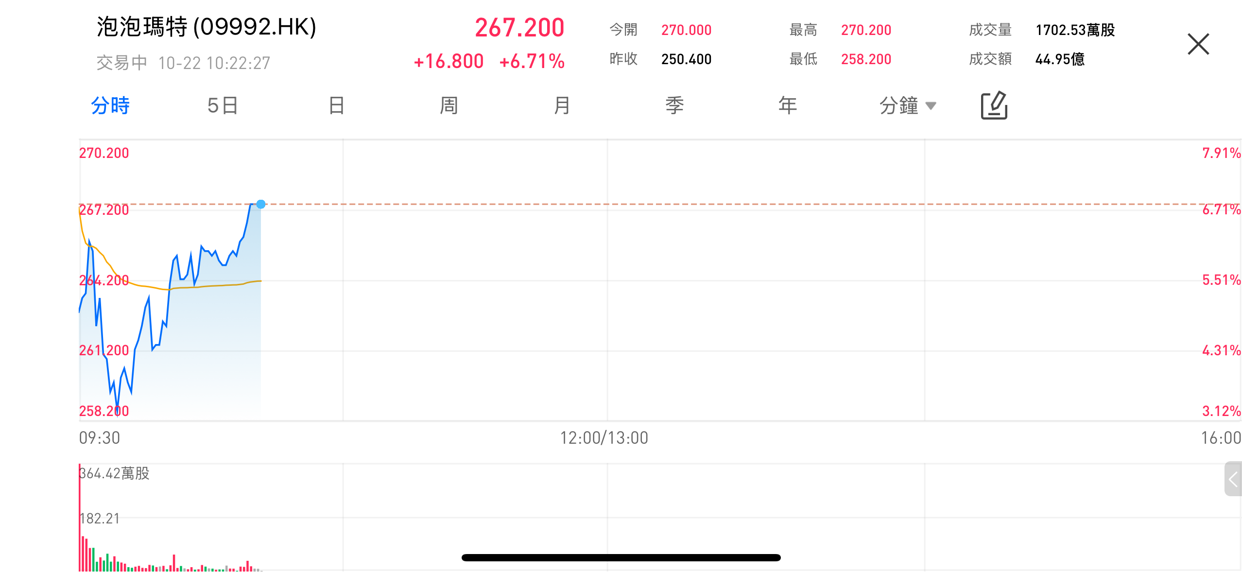 2025年10月22日,泡泡瑪特(Pop Mart,09992.HK)今天公佈了2025年第三季度未經審計的財報,顯示出強勁的收入增長,特別是海外市場的表現令人矚目。隨著財報的發佈,泡泡瑪特的股價也表現出積極反應,在早盤時一度上漲6.71%,達到267.2港元,較昨日收盤價250.4港元上漲17港元,突破270港元的關鍵水準。