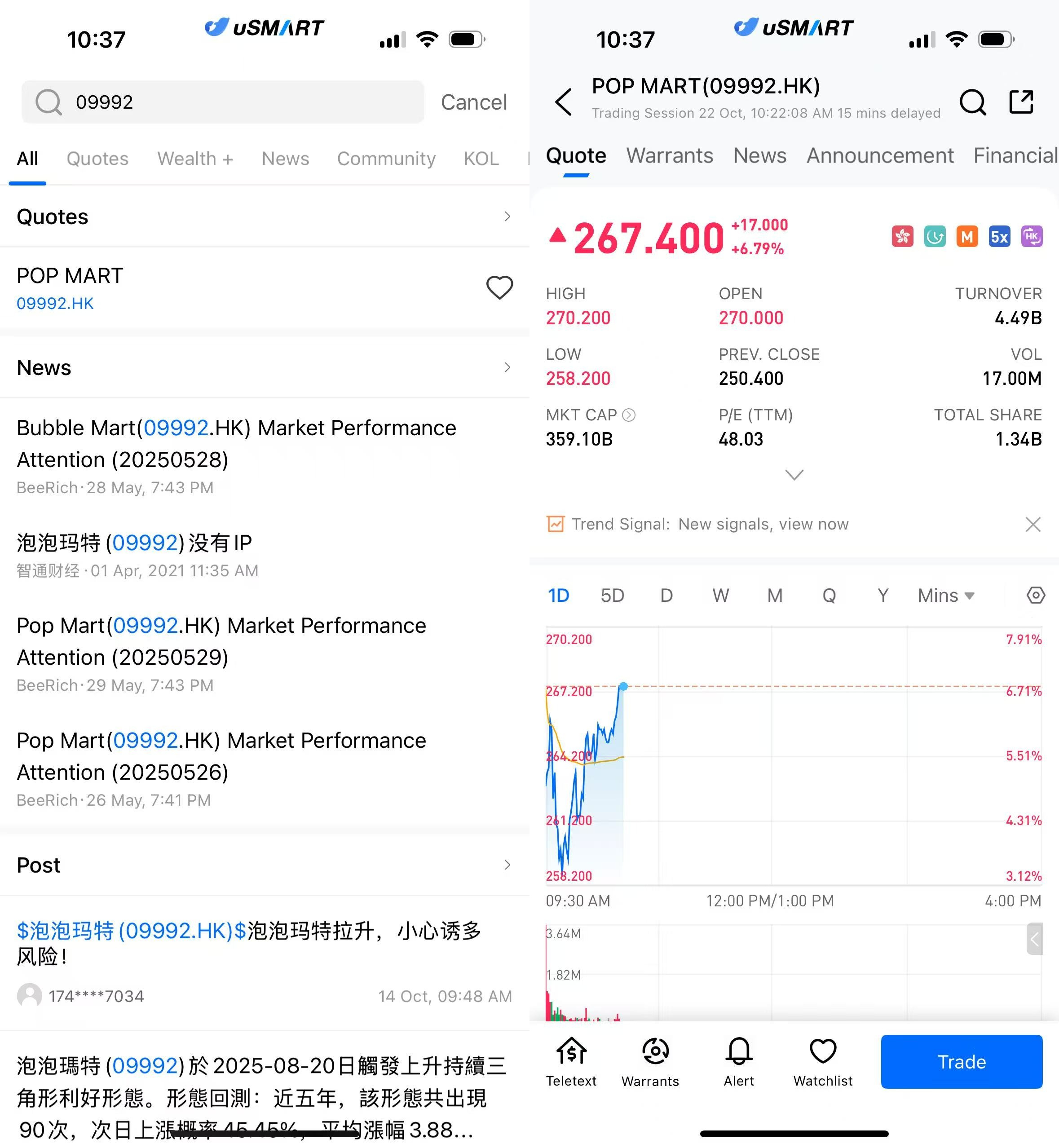 登入 uSMART HK APP 後,於頁面最右上方點擊「搜索」,輸入標的代碼(09992.HK)並進入詳情頁,瞭解交易詳情與歷史走勢。點擊右下角「交易」,選擇交易類型,最後填寫交易條件後送出訂單即可。