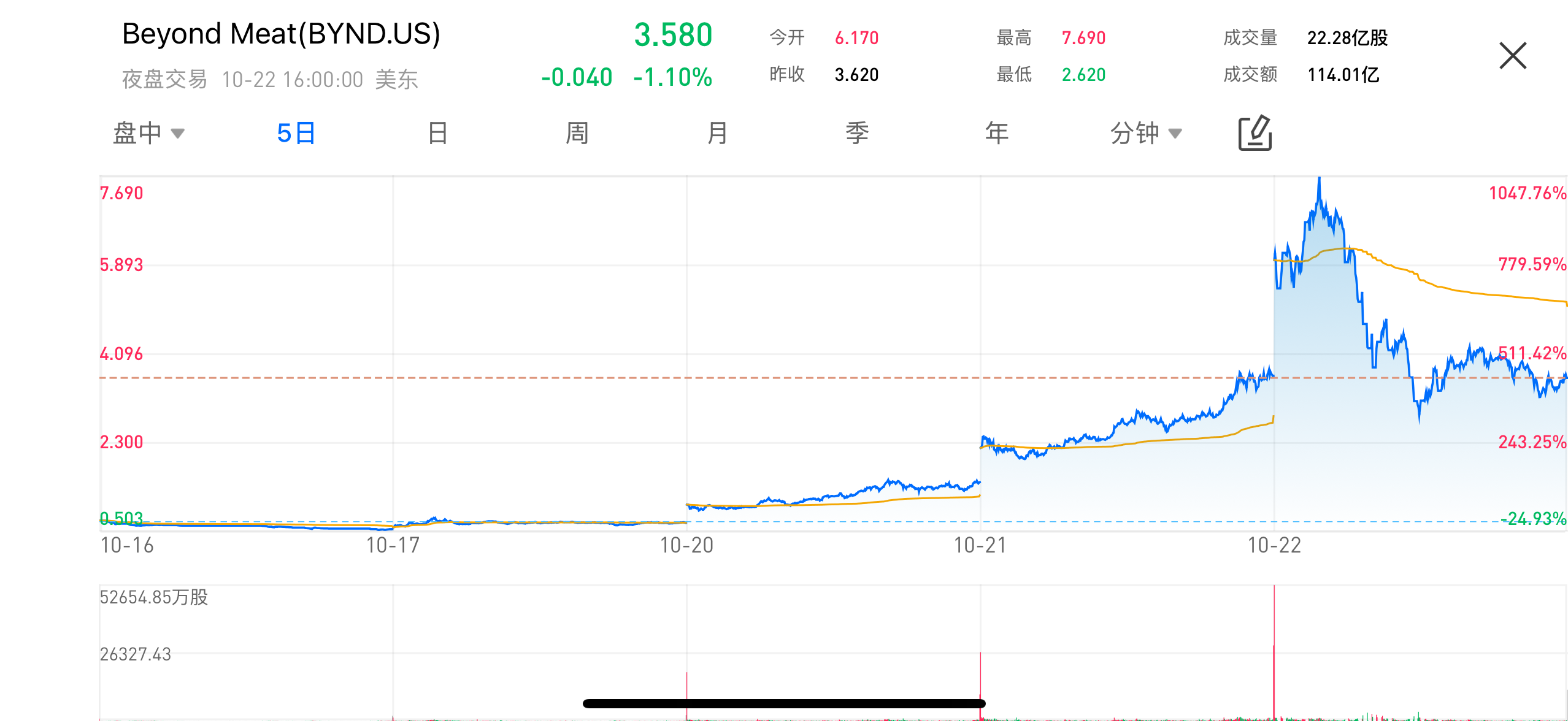 “人造肉第一股”Beyond Meat(BYND.US)近期再度成為美股市場焦點。伴隨社交媒體資金狂熱湧入,該股在短短三個交易日內 staged 一場瘋狂炒作行情:10月16日至10月22日期間,股價盤中一度從0.503美元暴漲至7.69美元,累計漲幅高達1047.76%,成交額激增至114.01億美元。然而泡沫迅速破裂,截至10月22日收盤,股價回落至3.58美元,較當日高點跌幅超過53%。