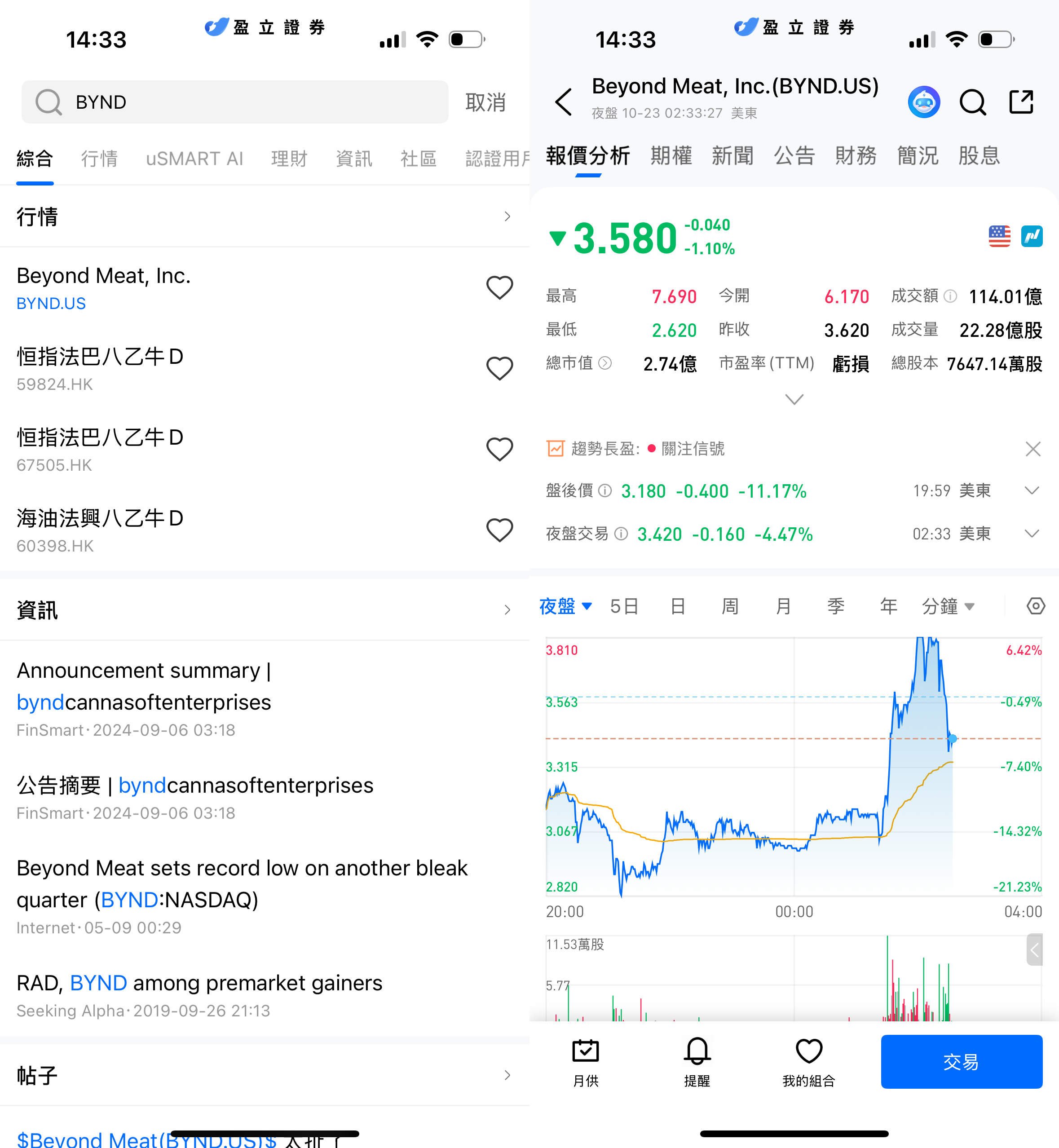 登入 uSMART HK APP 後,於頁面最右上方點擊「搜索」,輸入標的代碼(BYND.US)並進入詳情頁,瞭解交易詳情與歷史走勢。點擊右下角「交易」,選擇交易類型,最後填寫交易條件後送出訂單即可。