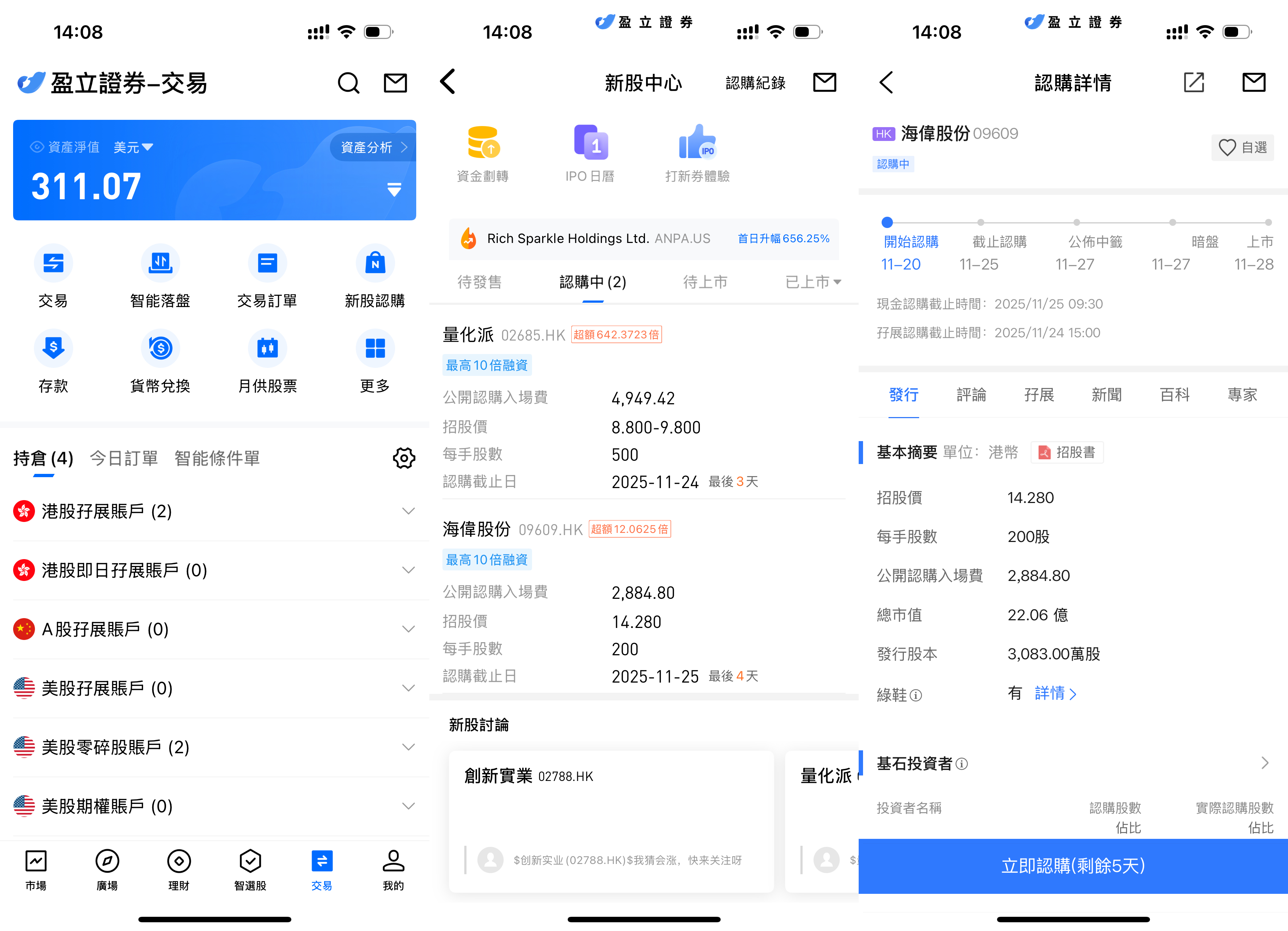uSMART HK App 設有 IPO 中心,提供獨家優惠,客戶可在 App 即時認購公開發售之新股。登入 uSMART HK App 後,點選右下角「交易」,進入「新股認購」,選擇海偉股份後點擊「公開認購」,填寫認購數量並提交訂單即可。