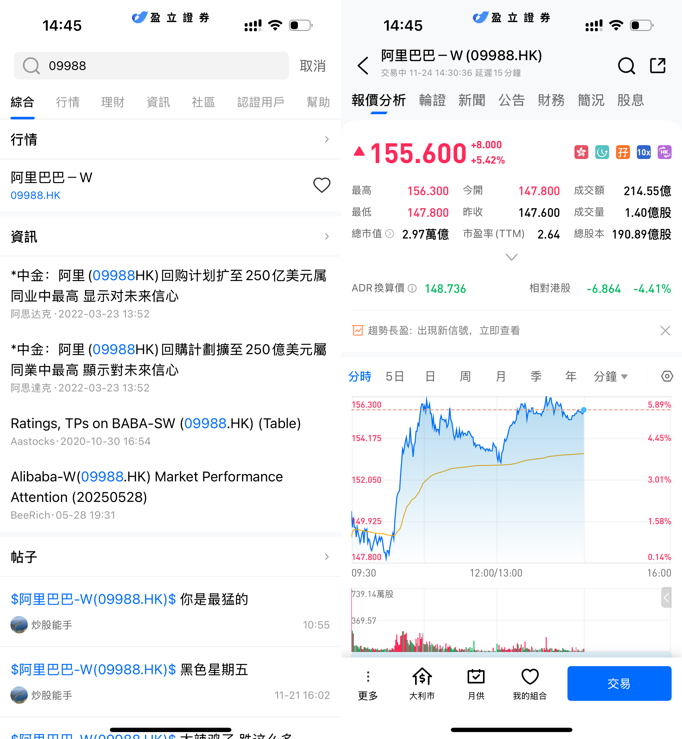 2025 年 11 月 24 日 —— 阿里巴巴 - W(09988.HK)今日早盤股價大幅拉升,截至 14點10分左右交易中,股價報 156.000 港元,單日漲幅達 5.69%;盤中最高觸及 156.300 港元,今開及最低均為 147.800 港元。從分時走勢看,股價在早間快速沖高後維持強勢震盪,目前成交額已達 200.11 億港元、成交量 1.31 億股,資金活躍度顯著提升,市場情緒積極,科技板塊整體走強也對其形成了助力。