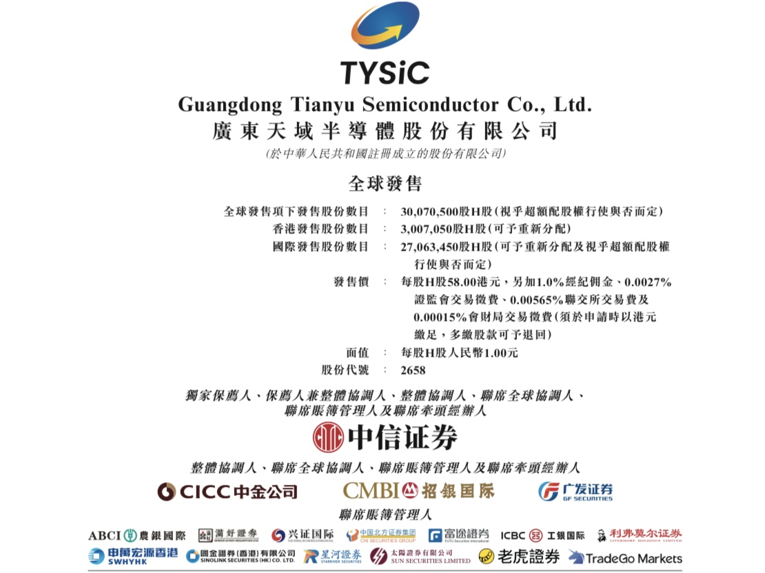 廣東天域半導體股份有限公司(GUANGDONG TIANYU SEMICONDUCTOR CO., LTD., 2658.HK)啟動香港IPO,招股期為2025年11月27日至12月2日,擬全球發售30,070,500股H股,並設15%超額配股權;每股發售價58.00港元,每手50股,入場費約2,929.24港元;預期2025年12月5日於聯交所主板掛牌,中信證券為獨家保薦人。