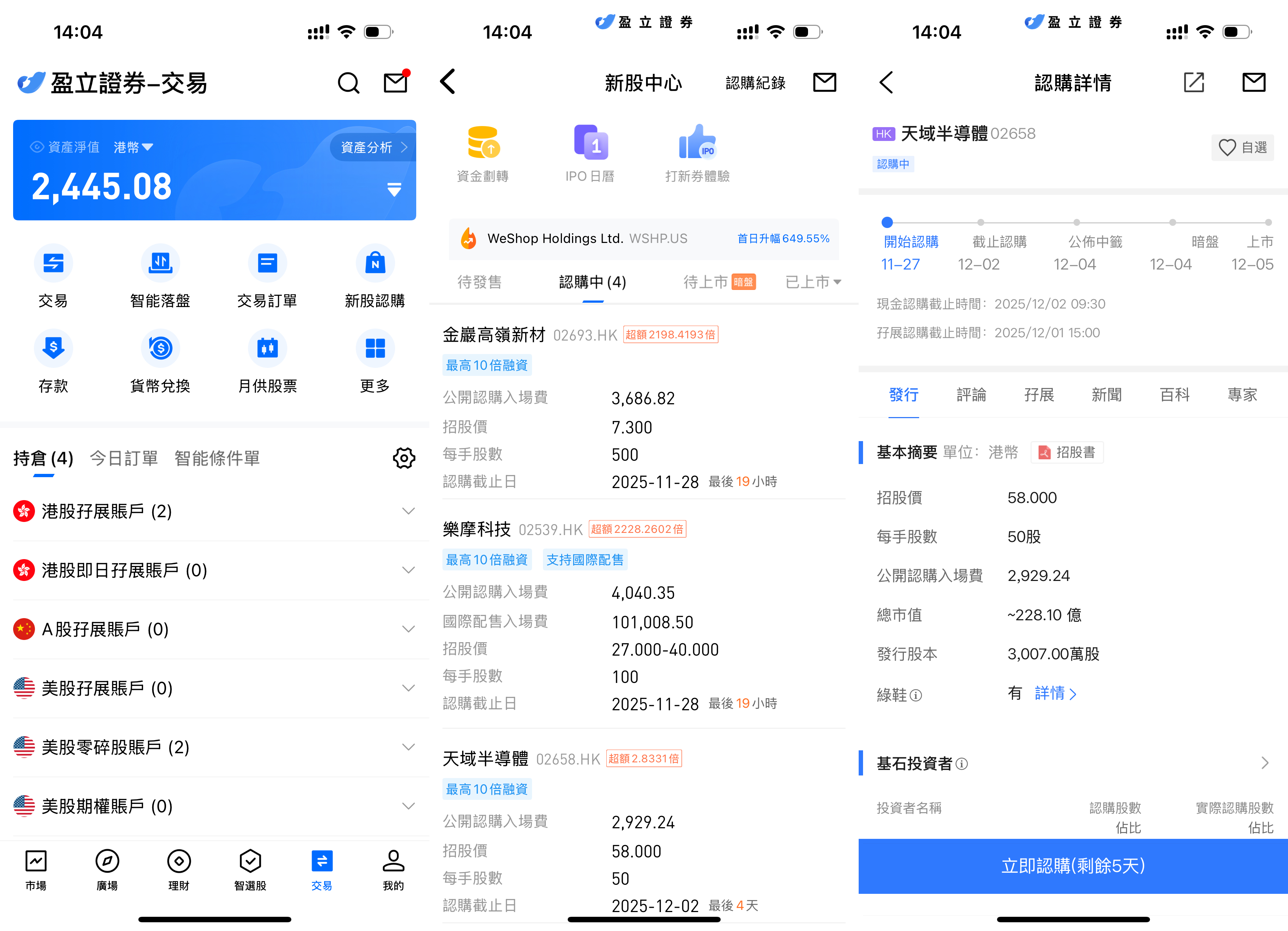 uSMART HK App 設有 IPO 中心,提供獨家優惠,客戶可在 App 即時認購公開發售之新股。登入 uSMART HK App 後,點選右下角「交易」,進入「新股認購」,選擇天域半導體後點擊「公開認購」,填寫認購數量並提交訂單即可。