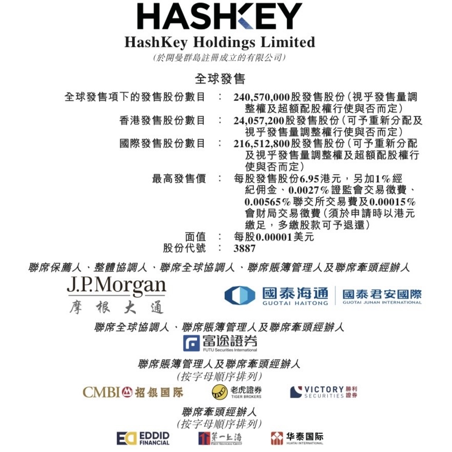 HashKey Holdings Limited(HashKey Holdings Limited,03887.HK)啟動香港IPO,招股期為2025年12月9日至12月12日,擬全球發售240,570,000股,並設約15%超額配股權;每股發售價介乎5.95—6.95港元,每手400股,入場費約2,808.04港元;預期12月17日於聯交所主板掛牌,摩根大通及國泰君安融資為聯席保薦人。