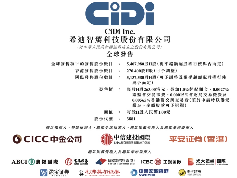 希迪智駕科技股份有限公司(CIDi Inc.,3881.HK)啟動香港IPO,招股期為2025年12月11日至12月16日,擬全球發售5,407,980股H股,並設超額配股權;每股發售價為263.00港元,另加相關交易費用,每手10股,入場費約2,656.52港元;預期12月19日於聯交所主板掛牌,聯席保薦人為中金公司、中信建投國際及平安證券(香港)。
