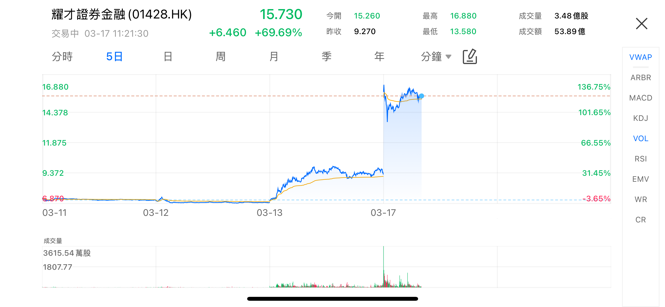 3月17日早盤,港股券商板塊明顯走強,其中 耀才證券金融(10428.HK)複牌後股價強勢拉升,盤初一度暴漲近70%。截至發稿,公司股價漲約69.69%,報15.73港元,成交額顯著放大。消息面上,公司宣佈螞蟻集團發起的要約收購已經獲得中國內地相關監管部門批准,預計將於3月30日完成交割,這也意味著歷時近一年的收購案即將正式落地。